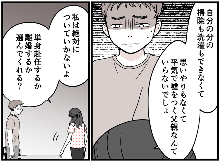 私はマオ。ハマダさんの一言で、明らかになった夫コウタの嘘。問い詰めるとどうやらコウタは「家事をしたくない」という身勝手な理由から、単身赴任を避けるため嘘をついていたようなのです。子どもの気持ちも私の負担も一切考えないあまりに自己中心的な言い分に、私は完全に呆れ果ててしまいました。コウタの行動は言うまでもなく家族への裏切りです。今回のことは簡単に許せそうにありません。コウタにはもう一度よく考えてほしいと思います。
