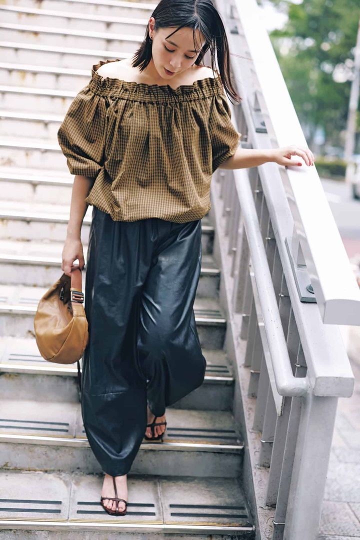 こっくりカラーは素材で切り替え「オフショル×レザーパンツ」