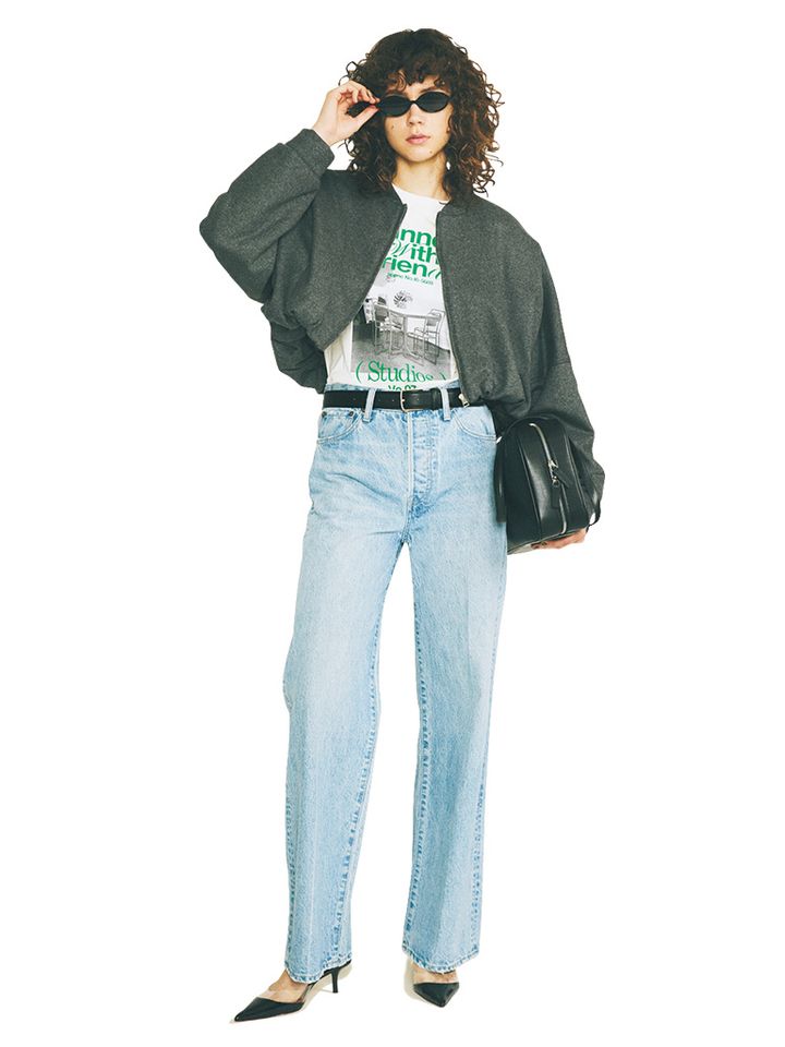 ヒップラインは拾わず位置を高く、脚をすっと流して縦長に見せる股上深めのストレートデニム。履き込んだような色あせた質感でもどこか品よく見えるのは白みがかったアイスブルーのおかげ。すっきりと履ける腰まわりのサイジングやセンタープレスがキレイを後押し。