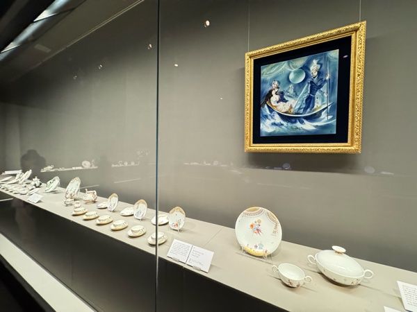 会場はマイセンのすばらしい食器やティーセットが数多く展示されており、さながらマイセンのショールームのようです。《アラビアンナイト》「月夜の船出」陶板画は繊細な筆致と深い色彩で描かれ、ヴェルナーの詩的な感性が存分に感じられる作品です。