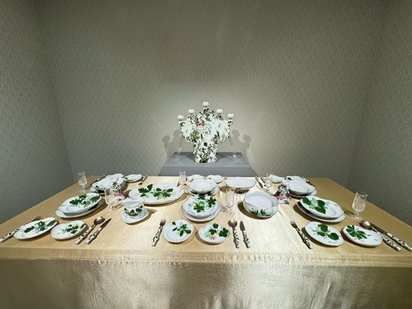 こちらの展示室では、実際のテーブルアレンジとともに食器と大燭台が展示されており、芸術性と実用性の調和が体感できます。撮影も可能です。
