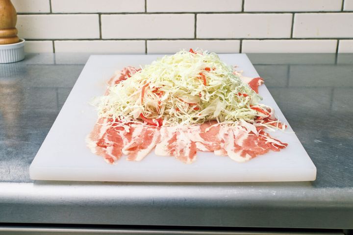 キャベツはせん切りにし、紅しょうがとざっと混ぜる。まな板に豚肉を幅約25cmくらいになるよう少しずつ重ねながら、縦長に並べる。