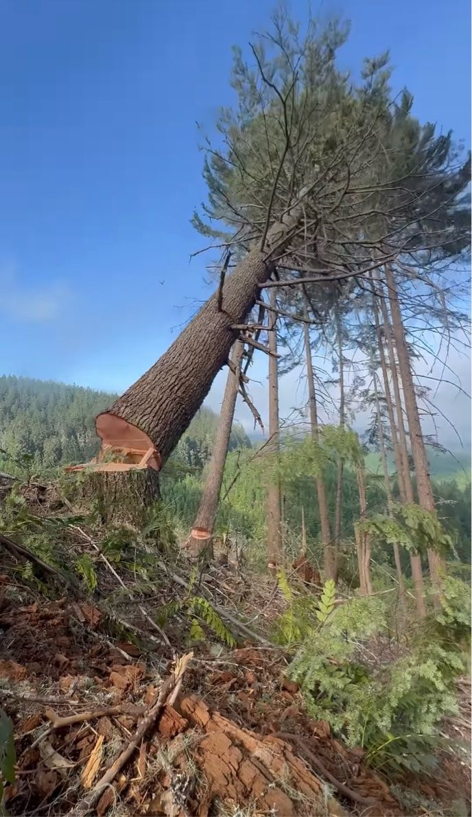 なんと、その大木が周囲の木々を次々となぎ倒していきました! 事前に切れ込みを入れてあった下の木々が、上から倒れてきた木に押されてドミノ式に倒れていったんですね。 そのため、あっという間に視界が開けて一面の景色が一変しています。