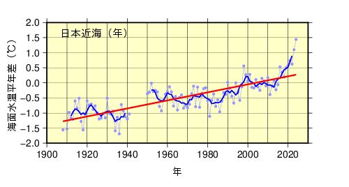 日本近海の海面水温が上昇する大きな要因は、気温の上昇です。以下の図は、日本の年平均気温偏差を表しています。