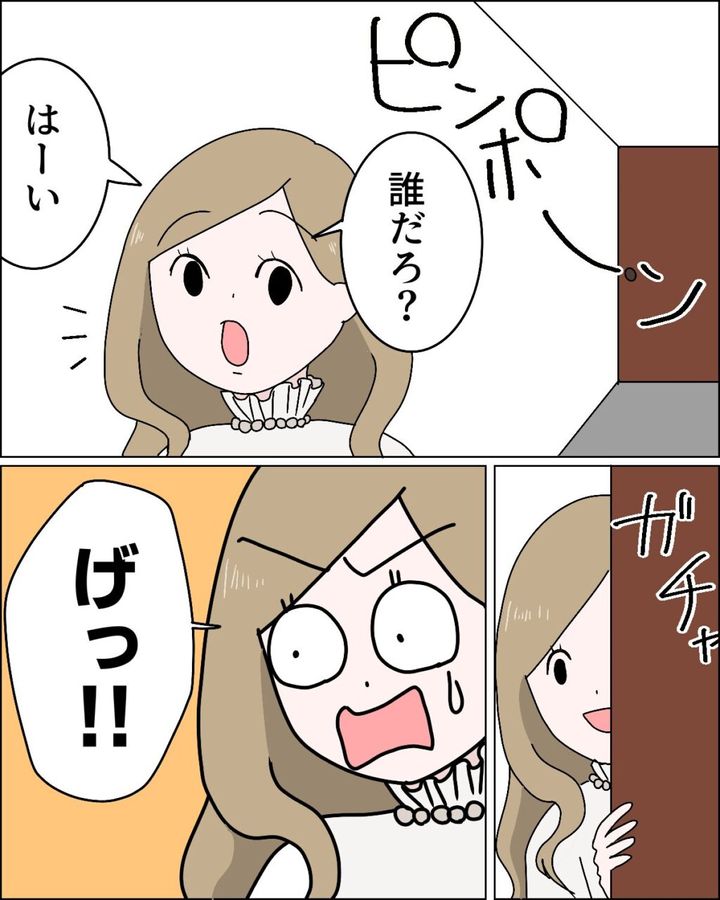 その時、ピンポーンとインターホンが鳴りました。「誰だろ?はーい」と玄関に向かったアミちゃんは、玄関を開けると「げっ!!」と驚いて目を見開きました。