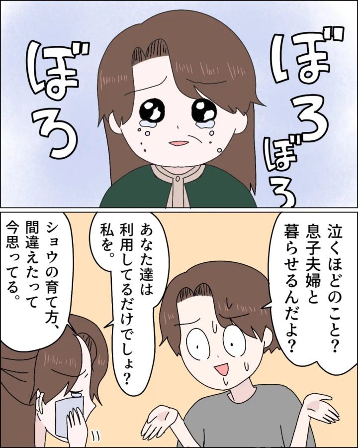 アミちゃんは自分が楽をするために私を利用したいだけ。ショウも私を便利な存在だと思っているだけで私の言うことを真剣に聞いてくれない。私は悲しくなってしまい、気づくとぼろぼろと涙があふれていました。私の涙を見ても、ショウは「泣くほどのこと?息子夫婦と暮らせるんだよ?」とやはり何もわかっていない様子。私は「あなた達は私を利用してるだけでしょ?ショウの育て方、間違えたって今思ってる」と涙ながらに言いました。