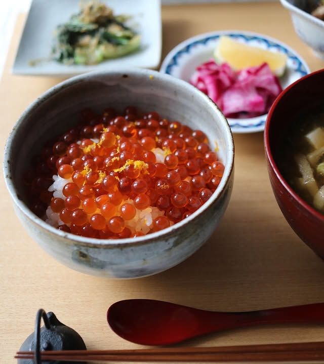 白いご飯に乗せたキラキラ輝く真っ赤ないくらは、見た目も華やかで食欲をそそります。まさに一気にかき込みたくなる魅力的な一膳。