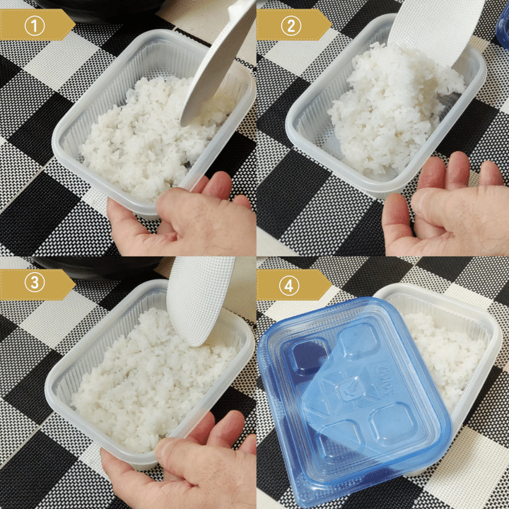 ふっくらと空気を含ませてよそい、お米同士の適度な隙間を確保しましょう。解凍時に出る水分とごはんとの接触面が少なく、ムラなく加熱できる構造のものを選ぶことで、冷凍ごはんがおいしくなります。