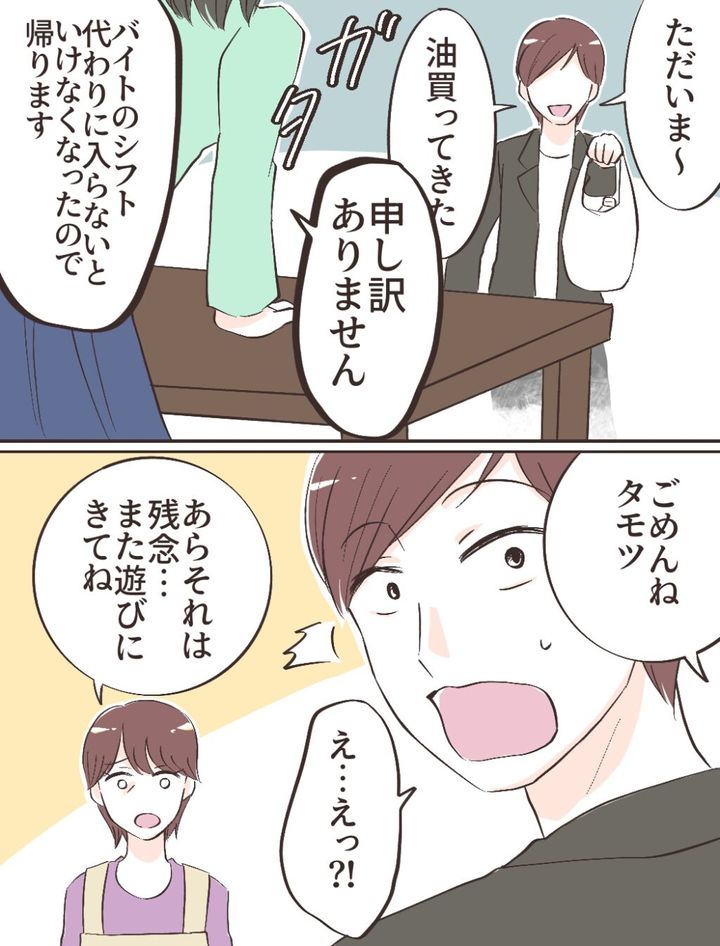 ちょうどそこへ、お母さんから頼まれて油を買いに行っていたタモツが帰ってきました。もうこれ以上ここにいたくない。私は反射的に「申し訳ありません」と言って立ち上がると、バイトが入ったと言い訳をしてタモツの家を後にしました。状況を読めずに慌てるタモツでしたが、振り返らずに帰る私背中に向かってお母さんは「粗それは残念。また遊びに来てね」と何もなかったように言いました。