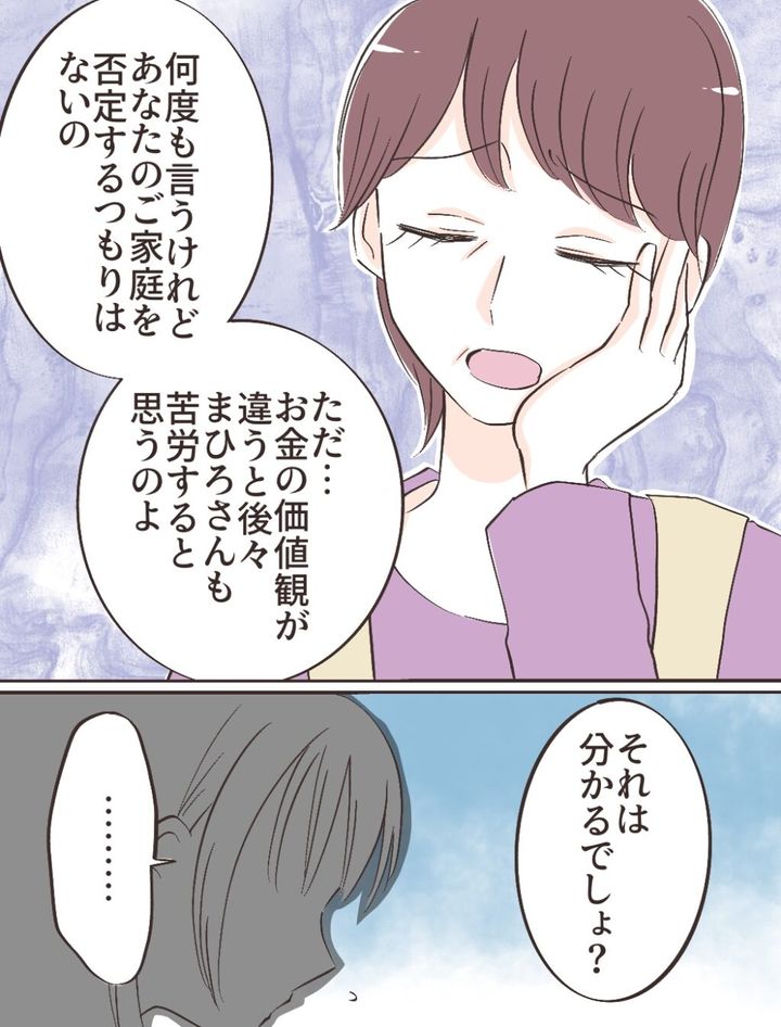 「あなたのご家庭を否定するつもりはない」と繰り返しながら、タモツと結婚したら頼られると決めつけることばかり。「お金の価値観が違うと、後々まひろさんも苦労すると思うのよ。それは分かるでしょ?」と上から諭すように言われました。