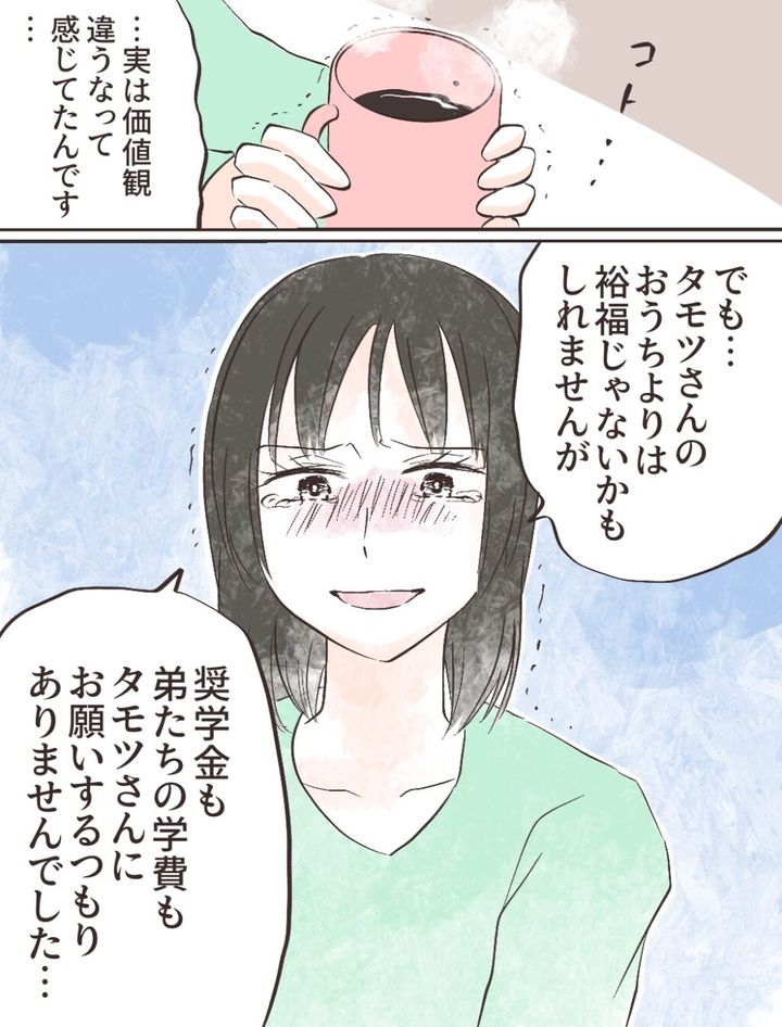 そう。タモツのお母さんが言うように、私もタモツとは価値観が違うと感じていました。うちはそんなに裕福ではありません。それでも、私の実家は金銭的に余裕がなくたって、奨学金や弟たちの学費をタモツに無心するなんて考えたことすらありませんでした。私は悔しくて情けなくて涙が溢れてきてしまいました。