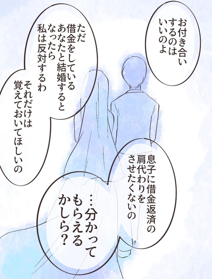 タモツのお母さんは、ただ付き合っているのは構わないけれど、奨学金という「借金」をしている私との結婚は反対だとハッキリ言いました。タモツに借金返済の肩代わりをさせたくないのだとまた繰り返して。