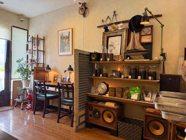 ドアを開けると、落ち着きのあるアンティーク調のインテリアに、1人用テーブル席が3つとカウンター席が2つ。