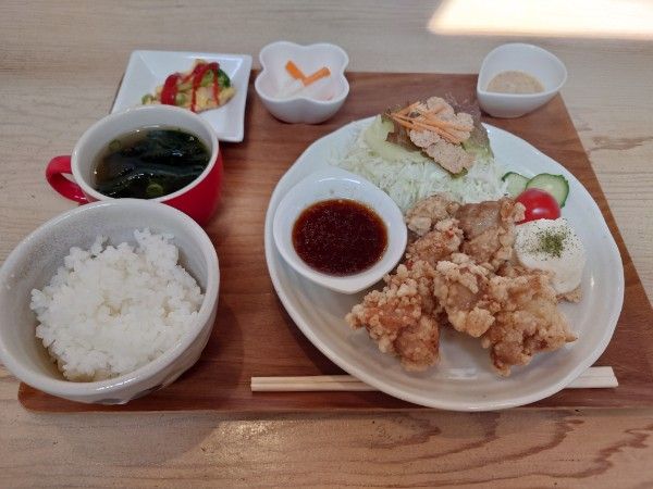 メインがサクサクの唐揚げでボリュームあり!モリモリサラダにポテトサラダ、野菜のキッシュに野菜の副菜、スープそしてドリンクもついています。お野菜がたくさんとれるのも素敵です!