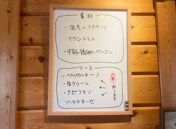次に、パスタに絡める「素材」と「ソース」を選びます。 素材は「海老とアオサノリ」や「イワシトマト」など、迷いますね~。 ソースは4種類から選びます。ペペロンチーノも気になるし、ナポリタンも捨てがたい。 みなさんはどれを組み合わせますか?!