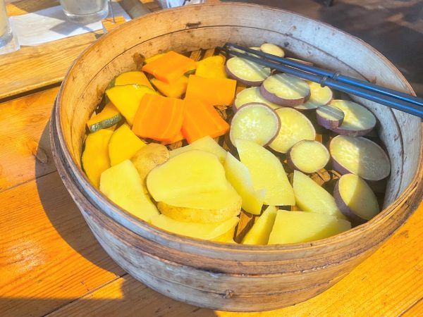 蒸し野菜はビュッフェ形式。ホクホク蒸したての温野菜がたくさん! ニンジンやサツマイモ、そして