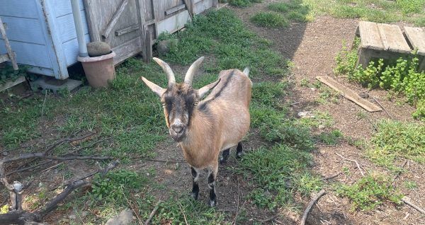 ヤギの麦ちゃんを発見! かわいい~!! カメラを向けたらこちらを見てくれました! もしや慣れてる…!?