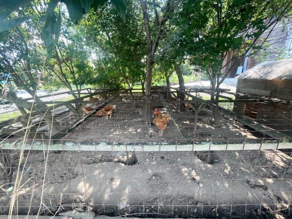 平飼いしているニワトリの軍団もいましたよ♪ 暑いのか、日陰でみんなひと休みしていました。