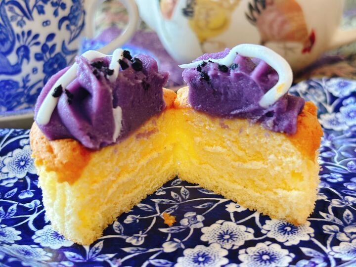 紫芋のペーストは、とてもねっとりとした食感です。とても甘みが強いですが、紫芋の味わいもしっかり感じられます。シフォンケーキがふわふわとした食感なのでとても良く馴染んで相性良いです…!