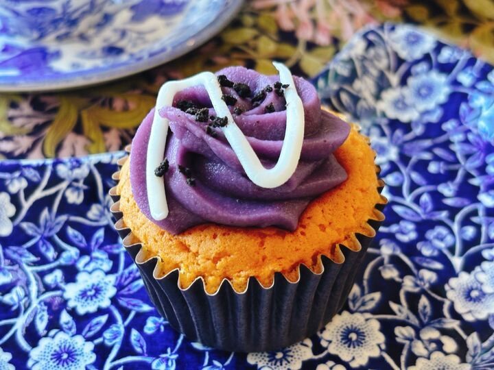 紫芋クリームのプチケーキは、紫芋ペーストが色鮮やかです。ミルクのアイシングとビスケットと粉のようなものがトッピングされています。