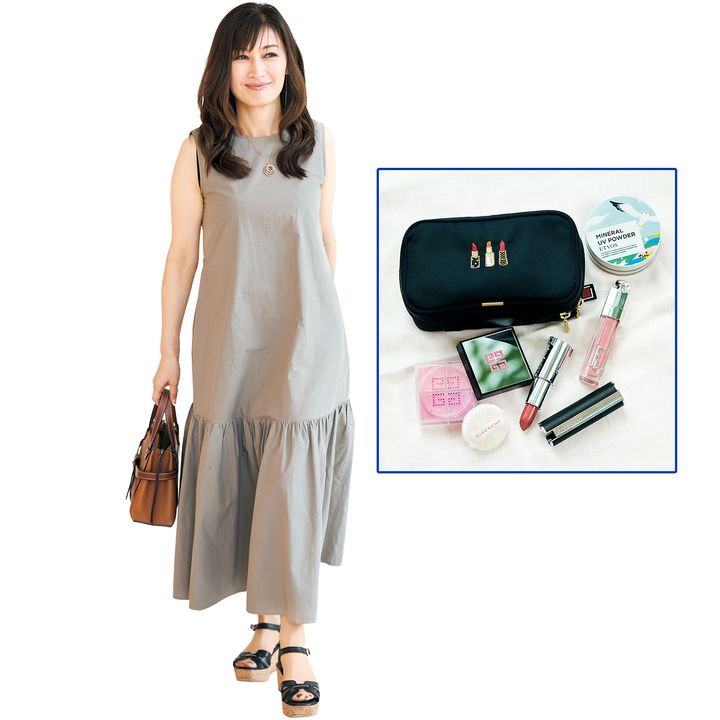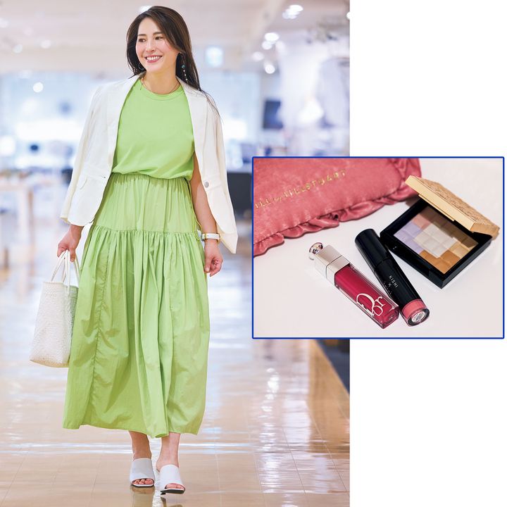 仕事柄、夏は毎日ほんのり血色肌になりがちです。上気した肌をあえて活かすシアーピンクなiminiのチークと、ディオールマキシマイザー007のリップを仕込んで、ほどよい血色感の清涼感メイク作りを心がけています。