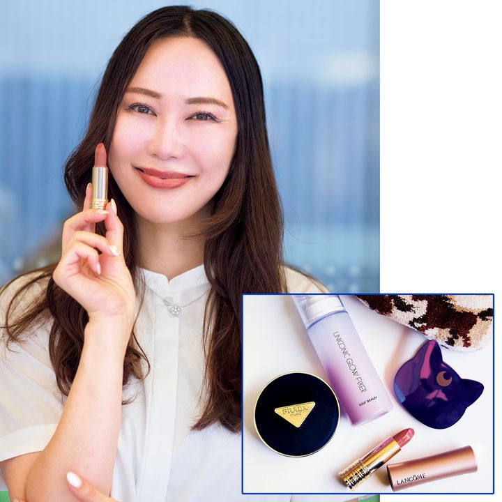 プラダのメッシュクッションファンデはセミツヤマット肌に仕上がるのでヘビロテ。ランコムのルージュ インティマットNの220は万能なヌーディピンク。ソフトマットでぼかしやすく、汗&皮脂にも強いので、チークとしても愛用しています。