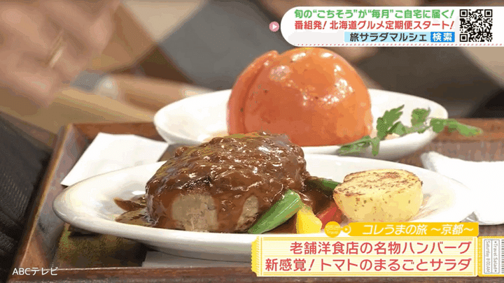 なお、この一連の様子は、10月4日に生放送された『朝だ!生です旅サラダ』で公開された。ほかにも大仁田アナは洛北エリアで、食べログの「パンWEST百名店」に選ばれたことがあるパンの老舗・マリーフランス北山店のカレーパンとあんパン、明治30年創業の洋食の老舗・キャピタル東洋亭本店のアルミホイルの包み焼きハンバーグステーキ、前菜メニューの中で人気な丸ごとトマトサラダを味わった。