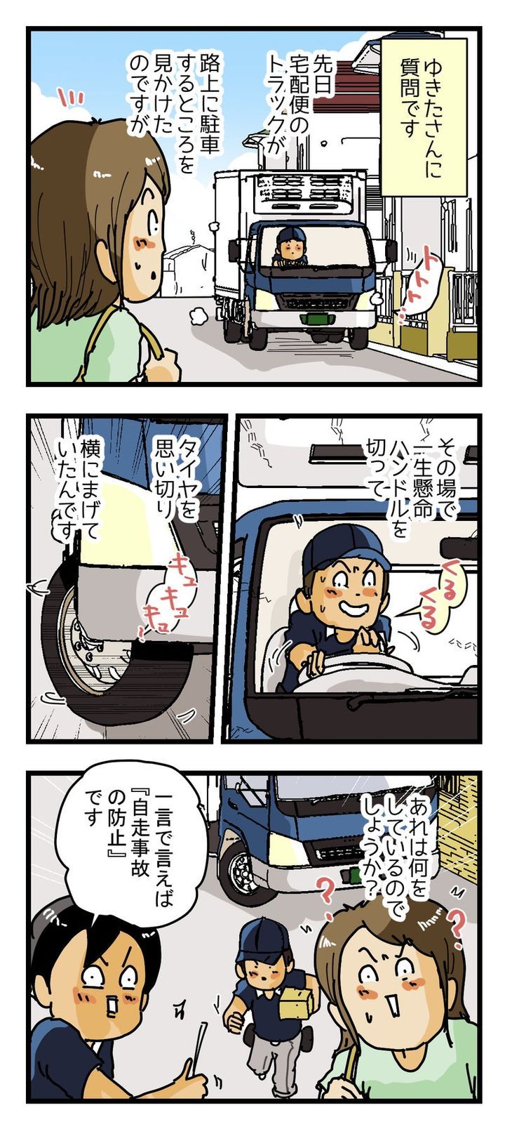 宅配便のトラックが路上に駐車した際、タイヤを横に曲げているのを見かけた読者。タイヤを横に曲げる理由は、「自走事故の防止」だそうで、万が一トラックが動いてしまっても、大事故にならないよう、タイヤを曲げて止まるのだそうです。