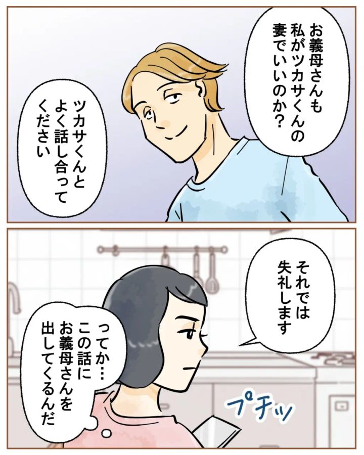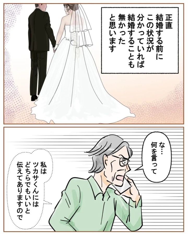 「理解し合って夫婦になっていく」と言った義母の言葉に同意したナズナさんは、でも、「理解し合えればなんですよ?」と否定。ツカサさんには歩み寄りがなかったと言うと、義母の顔が青ざめました。そして「私がツカサくんの妻でいいのか?よく話し合ってください」と言った後電話を切ったナズナさん、「男を見抜く力無さ過ぎじゃない?」と自戒してしまう気持ち、とっても良くわかります!
