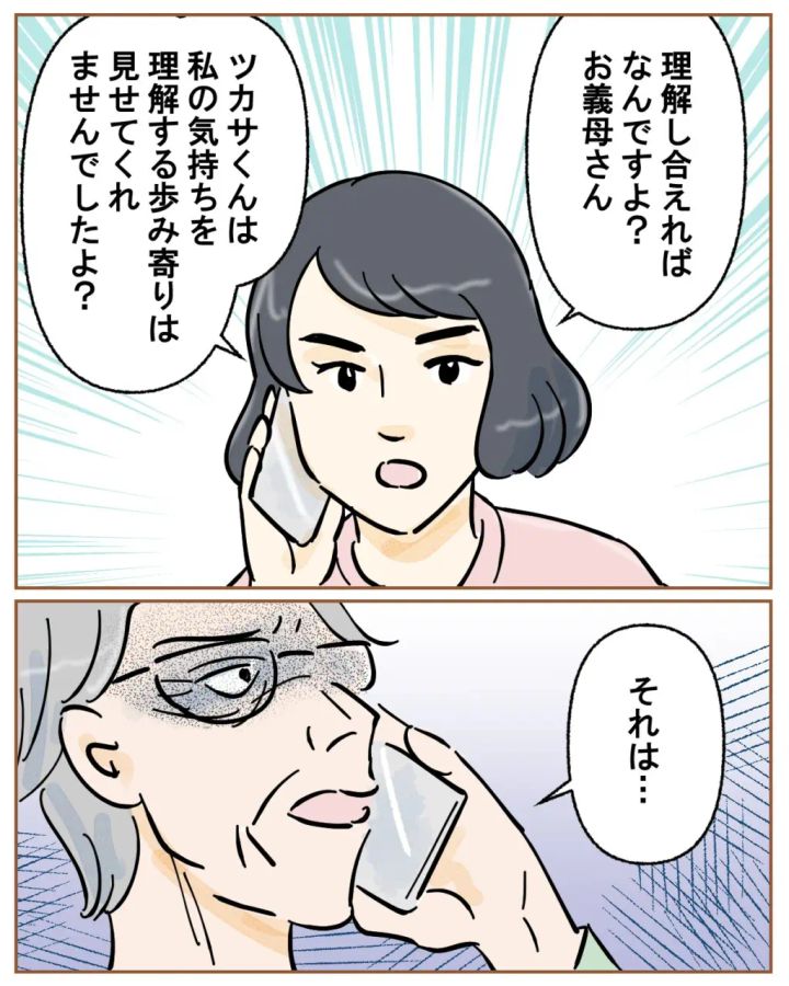 「理解し合えばなんですよ?お義母さん。ツカサくんは、私の気持ちを理解する歩み寄りは見せてくれませんでしたよ?」電話越しに義母に詰め寄ると、「それは・・」と義母は言葉に詰まりました。