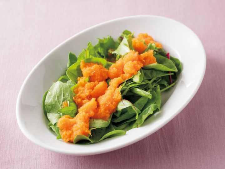 すりおろしたにんじんにオイルや酢を加えるだけで、手軽に作れる自家製ドレッシングに。甘みとフレッシュさが際立ち、野菜をたっぷり楽しめる一皿です。このドレッシングさえマスターすれば、シンプルな野菜サラダがごちそうに♪