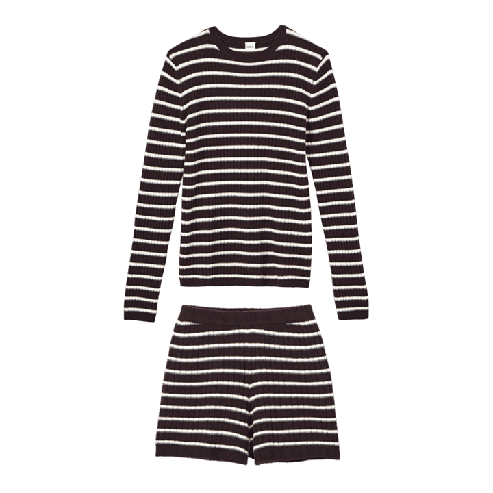 今季大注目の新ブランド、ユナス。ボーダーニットのセットアップは今っぽいスタイリングアイテムとして投入予定。シックな色合いとデザインはシャープな印象で着られます。
