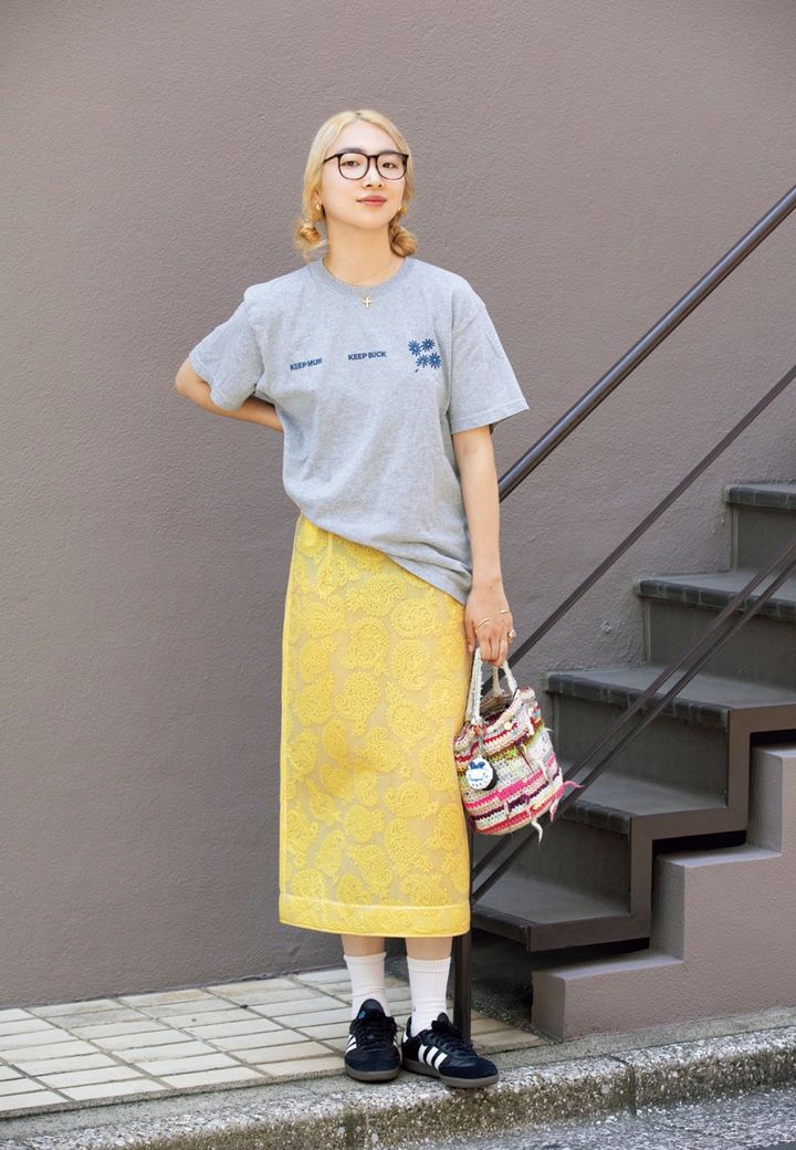 「鮮やかでシルエットのキレイなシアースカートとグラフィックTシャツを合わせて、カジュアルななかにも洒落てる感を演出するスタイリングに。暑い日でも快適に過ごせ、涼し気かつきちんとした印象が出せるスタイリングを意識しています」