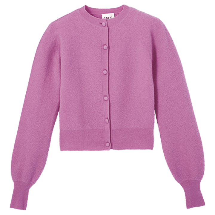 落ち着いた青みピンク、ふんわりとした袖、コンパクトな着丈で今っぽく着られる1枚。カーディガン¥38,500(ユナス/エストネーション)