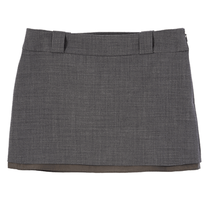 裏地がはみ出たようなレイヤード仕様でこなれたムードを演出。トラッドにもカジュアルにも使い勝手抜群。タイツ×ロングブーツに合わせて。ミニスカート¥38,500(ユナス/エストネーション)
