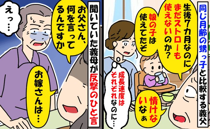生後7カ月の娘が離乳食、そしてコップ飲みに奮闘していたあるとき、義両親と一緒に旅行に行くことになりました。旅行先でストロー飲みでつまずく娘の姿を見た義父から「ストローも使えないのか? 情けない」と言われ、心を痛めていた私。すると、義母が義父をぴしゃりと一喝したのです!