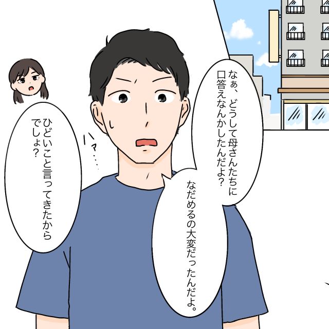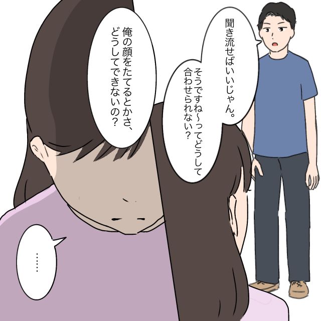 しかし、タケルは「そうですね~って聞き流せばいいじゃん、俺の顔を立てるとか、どうしてできないの?」と全く響いていない様子。義両親とそっくりな態度に、私は思わず下を向いて黙り込んでしまいました。
