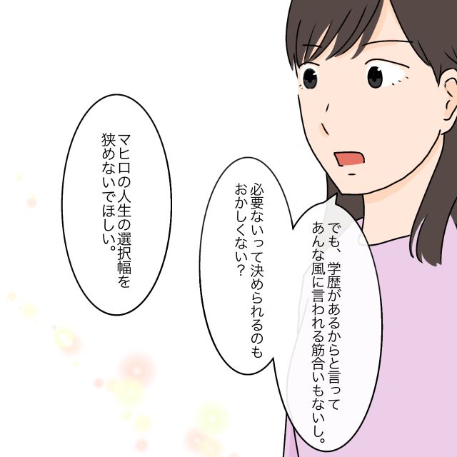 私はタケルに、「学歴があるからと言ってあんな風に言われる筋合いはない、はじめから必要ないって決められるのはおかしい」と自分の考えを伝えました。「男は外で働き、女は家を守る」という古い考えに囚われて、マヒロの人生の選択幅を狭めることは親としてしたくないし、ましてやそれを他人から強要される筋合いもありません。