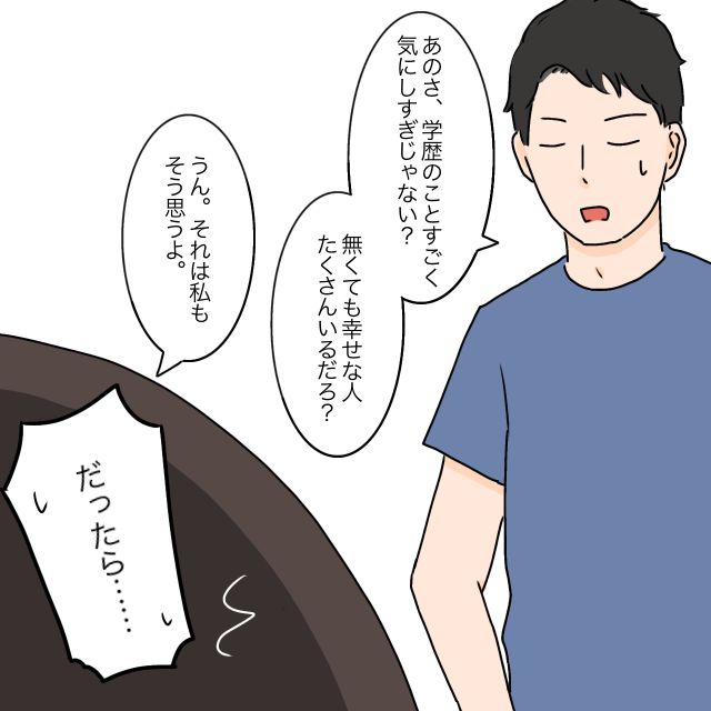 タケルは少し呆れた様子で、「学歴のことすごく気にしすぎじゃない?無くても幸せな人はたくさんいるだろ?」と言いました。私も学歴がすべてとは思っていません。タケルの言う通り、学歴が無くても幸せに暮らしている人はたくさんいます。だけど私が言いたいのはそうじゃない。