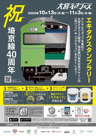 JR大宮駅と駅周辺の大型商業施設などで、10/13(月・祝)~11/3(月・祝)に「埼京線開業40周年×大宮えきフェス エキタグスタンプラリー」を開催。
