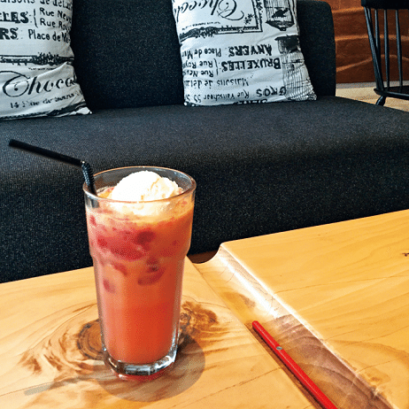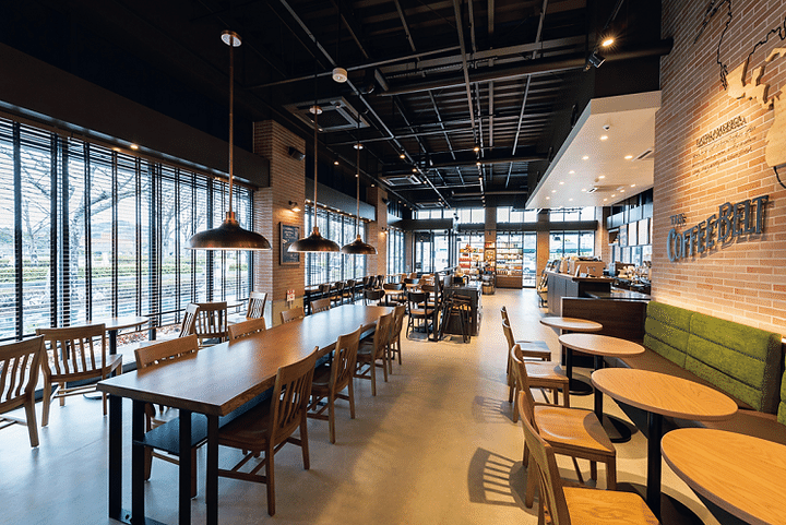 公園内の目印でもある、外観にデザインされた大きなロゴが写真映え抜群。ドリンクを手前に入れてロゴを効かせたり、工夫次第で店舗の広さも伝わる写真に。