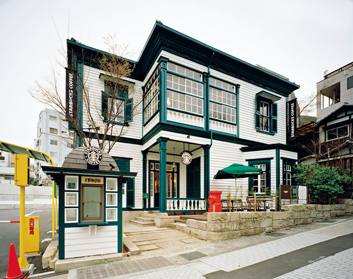 1907年に建築された米国人所有の木造2階建ての洋館を、2001年に再建・移築。緑と白の外観と、当時のたたずまいを感じることのできる建具やフローリングを活かした空間が特徴。この店舗のために作られた木製の店舗ロゴにも注目を。