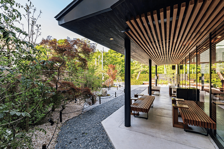 参道側に前庭があり、建物は宇治の街並みに調和する切妻屋根の佇まい。軒下には縁側のような座席を設けていて、庭や宇治川の遊歩道に連なる桜や新緑、平等院境内の紅葉など、京都らしい四季折々の景色が楽しめるロケーションが魅力です。