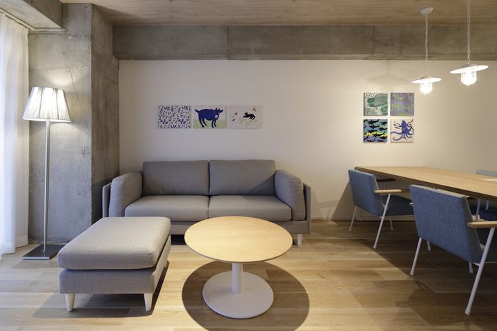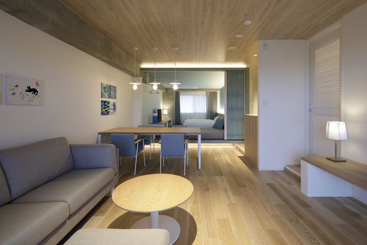 「スイート」はくつろげる広々としたリビングに、テーブルも完備。68㎡の広さで、最大4人のステイが可能です。