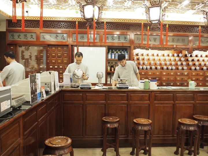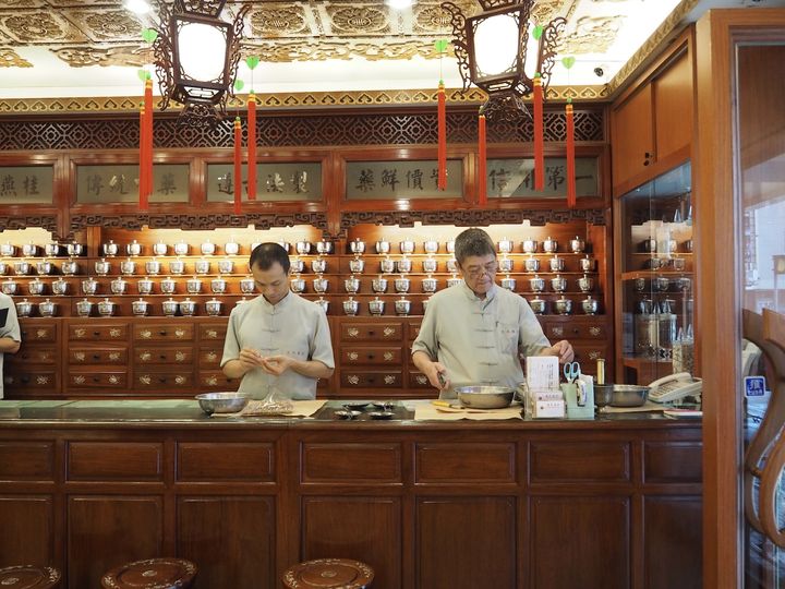 店舗の中は台湾らしい伝統的な造りの装飾。棚にはたくさんの漢方の瓶が並べられています。受付で漢方を処方して貰いたい旨を伝えると、お店の裏手にある漢方医がいる診療所へ案内されます。そこで血圧や現在の症状、どんな漢方を処方して貰いたいかを伝え、処方箋を受け取ります。