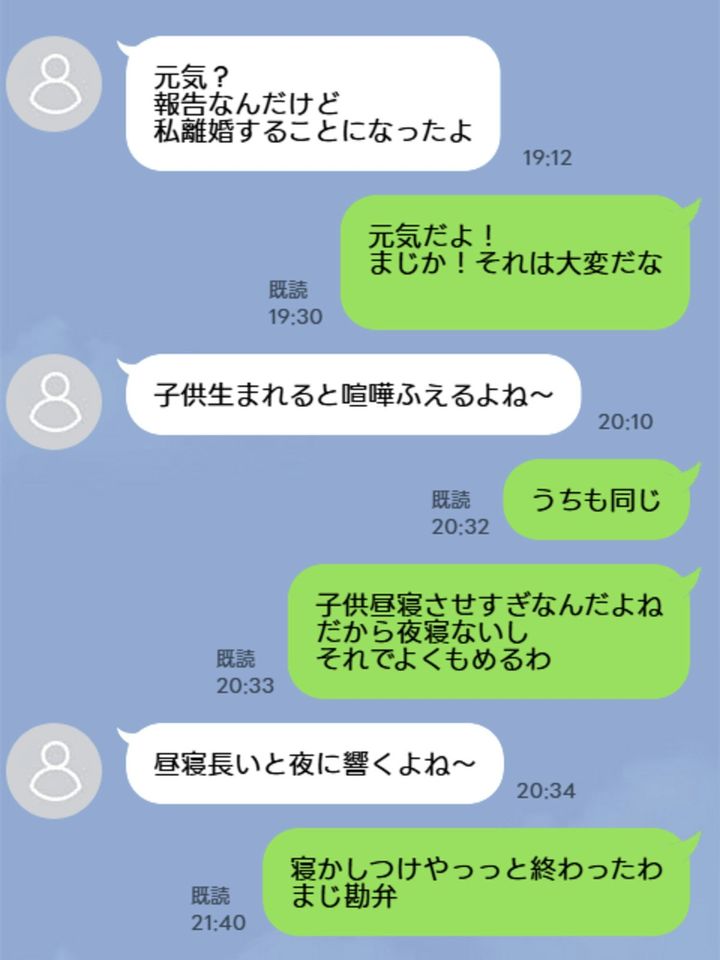 別に会ったりしてるわけじゃないし、このラインしてる頃、旦那から私に、大学時代の友達が離婚することになったってラインきてさーもーラインしてくんなよって感じだよ