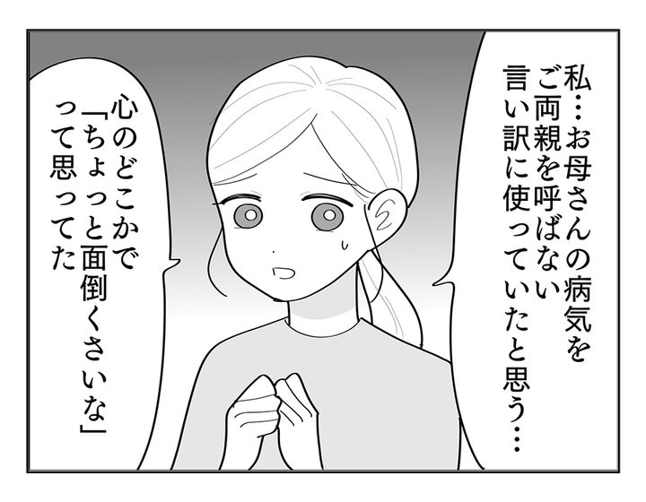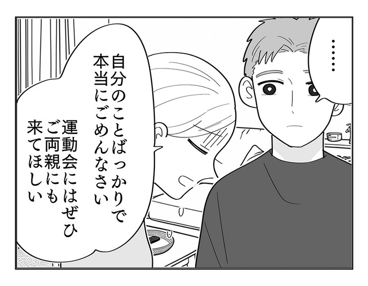 エリさんは夫のコウタさんと息子のアオトくんと暮らしています。アオトくんがはじめての運動会を控えるなか、実家のお母さんに大きな病気が見つかりました。大切なお母さんに気兼ねなく運動会を楽しんでほしくて、コウタさんに「義両親には遠慮してもらいたい」と伝えたエリさん。しかし夫婦で口論になり、エリさんは感情だけで勝手なことを言ってしまったと反省します。翌日エリさんは、帰宅したコウタさんに心から謝りました。