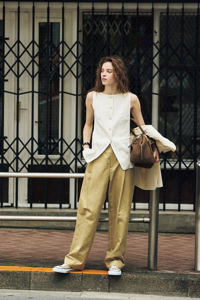 落ち着いた雰囲気ではけるうえ、スニーカーとも相性がいいすそ幅。腰から下の気どらなさが、ONに向く装いのほどよい抜けとして作用。セットアップだとフォーマルなベストがチノのおかげでリアルに着地。キレイめな印象はキープするため、チノとなじませるように、スニーカーはベージュを選択。