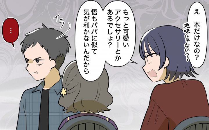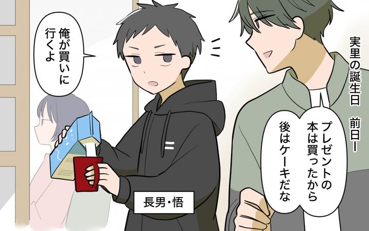 悟がプレゼントに選んだ実里が読みたがっていた本を渡すと、実里は喜んでくれた。だが、咲は「本だけ?地味じゃない?」と文句を言い、悟が選んたプレゼントを否定した。悟と実里の表情が曇り、重苦しい空気が流れる。