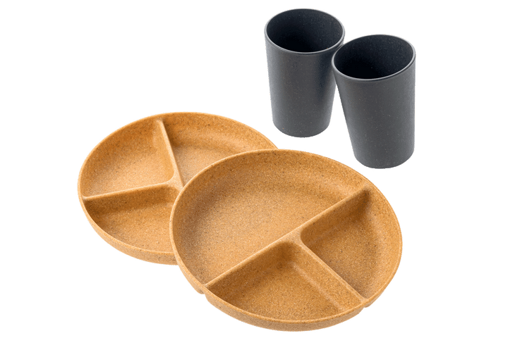 レンジで使えるヤシの端材を使ったカップ 約H12×W8.3cm 各399円、同仕切り付きプレート 約H3.3×W21cm 各499円